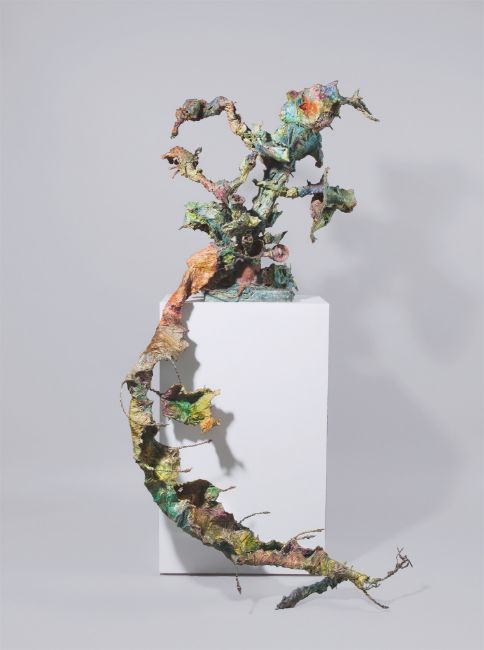 Oil over wood, metal, plaster, gauze, paper and wire. 81 × 50 × 74 cm (with mounted base 1,70 cm) ( 31 ⅞ × 19 ⅝ × 29 ⅛ in. (with mounted base 1,70 in.)).