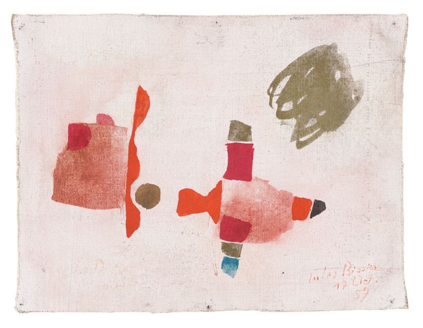 Eiöltempera auf Leinwand. 17,5 × 23 cm ( 6 ⅞ × 9 in.). Unten rechts signiert und datiert: Jules Bissier 17 Oct 57.