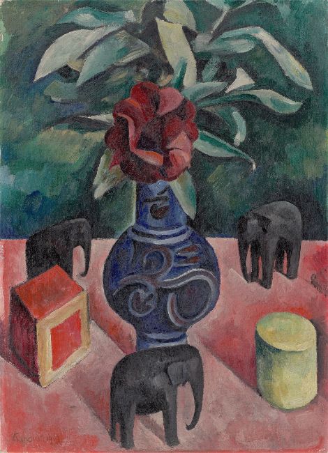 Oil on canvas. 55,3 × 40 cm ( 21 ¾ × 15 ¾ in.). Signed and dated lower left: Kanoldt 1919. Titled, dated and signed with blue chalk on the stretcher: Stilleben 1919 VIII Kanoldt.