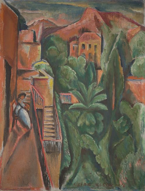 Oil, two-sided on canvas. Within frame each 64,5 × 49,2 cm ( 25 ⅜ × 19 ⅜ in.). Signed and dated lower right (“Südliche Landschaft“): CESAR KLEIN 1916.