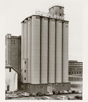 Silbergelatineabzug. 58 × 45,5 cm (61 × 52,6 cm) (22 ⅞ × 17 ⅞ in. (24 × 20 ¾ in.)). Rückseitig mit Bleistift signiert: Bernd Becher Hilla Becher. Ebendort betitelt und datiert: GRAIN ELEVATOR DUISBURG, D. PHOTO 2002.
