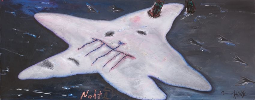 Öl auf Leinwand. 100 × 250 cm (39 ⅜ × 98 ⅜ in.). Unten mittig betitelt, signiert und datiert: Naht II Immendorff 84.