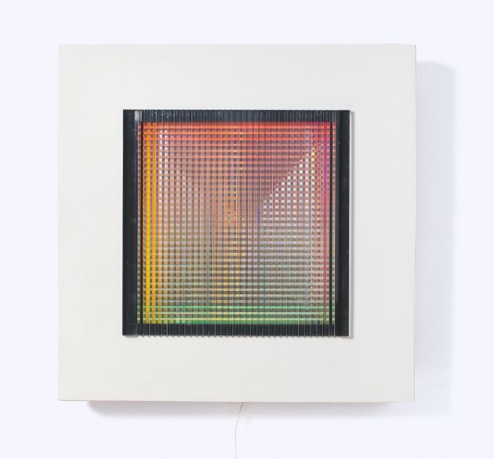 Lichtobjekt in lackiertem Holzobjektkasten. 72 × 72 × 5 cm (28 ⅜ × 28 ⅜ × 2 in.). Rückseitig auf dem Künstleretikett signiert und mit Richtungspfeil bezeichnet.