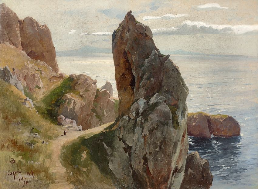 Öl auf Leinwand auf Pappe. 45,5 × 61,5 cm (17 ⅞ × 24 ¼ in.). Unten links monogrammiert (ligiert), bezeichnet und datiert: FP Capri 14/5 91. Rückseitig auf einem Aufkleber mit Feder in Braun beschriftet: Italien Studie von Capri Polyphem 61.