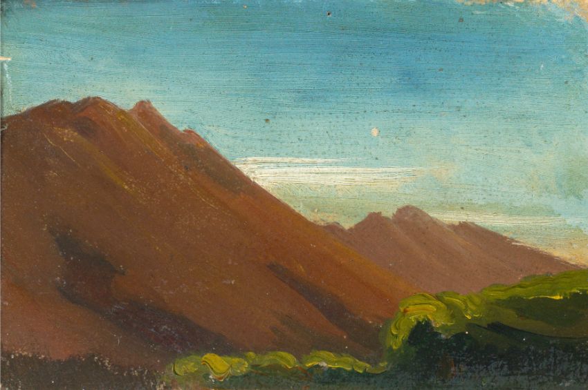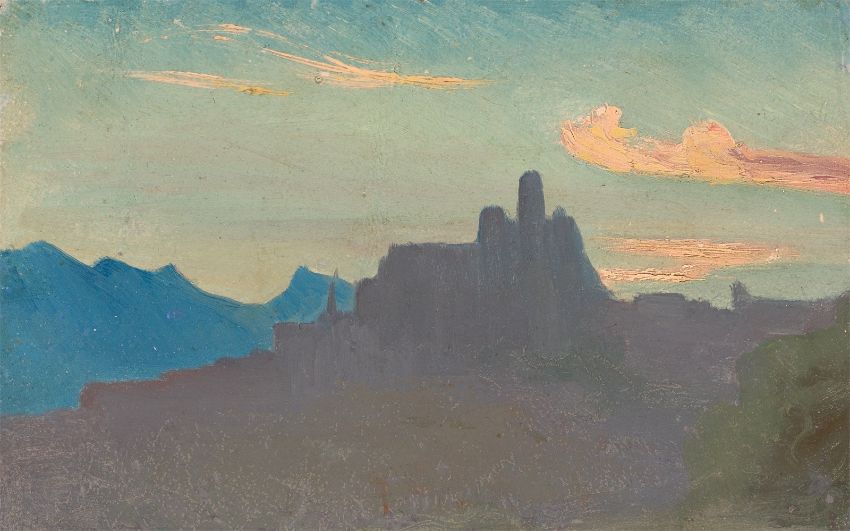Johann Heinrich Schilbach (Barchfeld 1798 – 1851 Darmstadt). Zwei Ölstudien: „Bei Olevano (Sabiner Berge)“ / Silhouette einer italienische Stadt bei Abendlicht.
