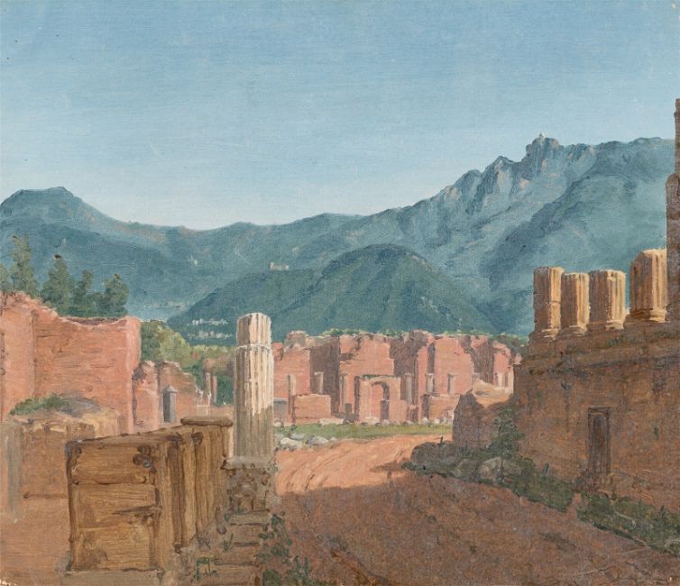 Öl auf Bütten. 29,3 × 34,1 cm (11 ½ × 13 ⅜ in.). Rückseitig unten mit Feder in Schwarz signiert und betitelt: W. Zahn. Ansicht vom Forum Pompeji mit dem Tempel des Jupiters vorne zur Rechten und im Hintergrunde der Monte St. Angelo bei Castelamare. Unten rechts der Stempel Lugt 4643.