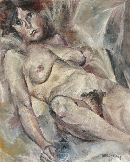 Öl auf Leinwand. 60 × 48,5 cm (23 ⅝ × 19 ⅛ in.). Unten rechts signiert und datiert: SCHAD-FOHR 19. Auf dem Keilrahmen in Schwarz betitelt, datiert und bezeichnet (verblasst): AKT 1919 GENF. Dort auch ein maschinenschriftliches Etikett der Ausstellung Berlin 1978.