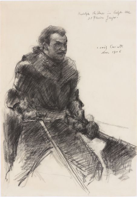 Kreide auf Papier. 55,7 × 38,7 cm (21 ⅞ × 15 ¼ in.). Oben rechts bezeichnet, signiert und datiert: Rudolph[!] Rittner im letzten Akt des Florian Geyer. Lovis Corinth Nov. 1906.