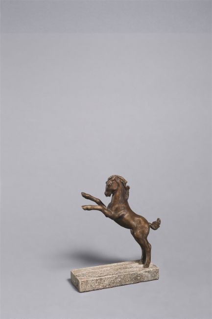 Bronze mit brauner Patina, auf Steinsockel montiert. 15,2 × 14 × 5 cm (6 × 5 ½ × 2 in.).