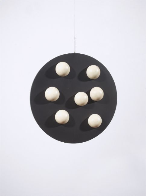 Holzobjekt: Scheibe, beidseitig mit beweglichen Halbkugeln. Durchmesser: 50 cm, Tiefe: 10 cm (19 ⅝ in., Tiefe: 3 ⅞ in.).