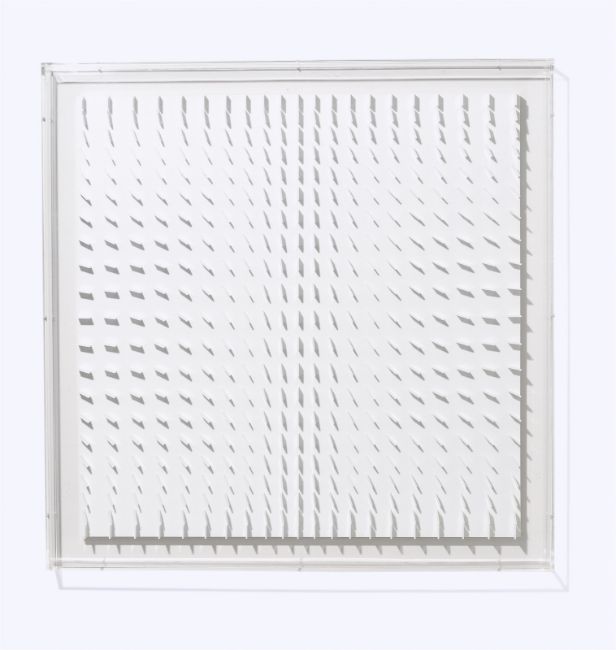 Weiße Acrylglaselemente in Acrylglasbox. 96,5 × 95,5 cm (38 × 37 ⅝ in.). Auf dem rückseitigen Etikett mit den gedruckten Werkangaben mit Kugelschreiber in Blau signiert: Böhm.
