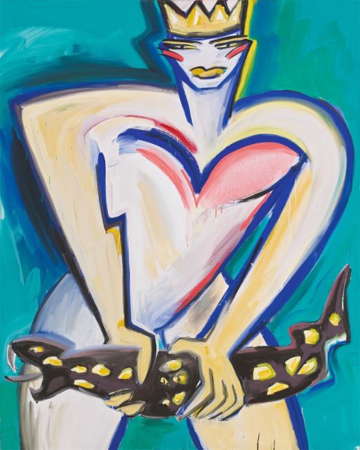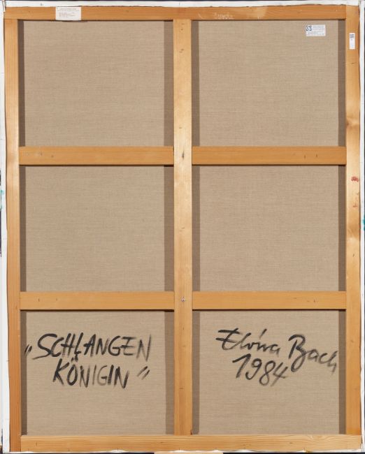 Acryl auf Leinwand. 161,7 × 131 cm (63 ⅝ × 51 ⅝ in.). Rückseitig mit Pinsel in Schwarz betitelt, signiert und datiert: „SCHLANGENKÖNIGIN“ Elvira Bach 1984. Auf dem Keilrahmen mit einem Etikett der Galerie Catherine Isser, Saint-Paul-de-Vence.