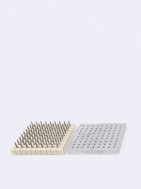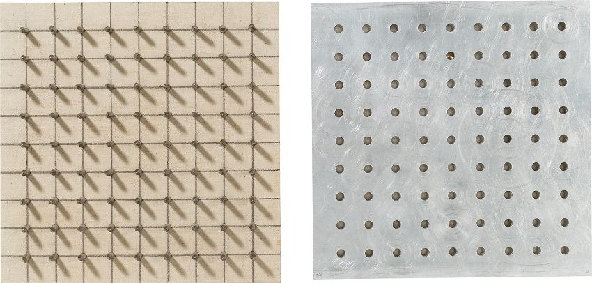 2-teilig: Nägel und Bleistift auf Leinwand auf Holz und Aluminiumobjekt. 20 × 20 × 4,5 cm und 20 × 20 × 2 cm (7 ⅞ × 7 ⅞ × 1 ¾ in. und 7 ⅞ × 7 ⅞ × ¾ in.). Signiert und bezeichnet.