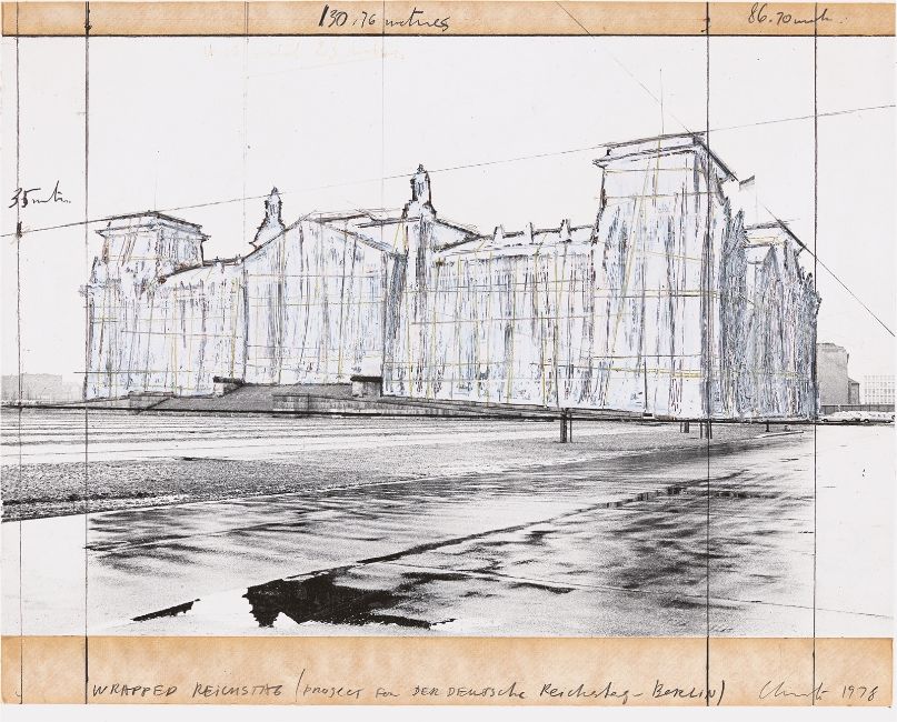 Deckweiß, Kugelschreiber und Bleistift über Fotografie auf Karton, auf Keilrahmen montiert und im originalen Acrylglasrahmen. 24 × 30,5 cm (9 ½ × 12 in.). Unten mittig mit Bleistift betitelt, bezeichnet, signiert und datiert: WRAPPED REICHSTAG (project for Der Deutsche Reichstag-Berlin). Oben mit technischen Angaben bezeichnet: 130,76 metres 86,70 metre. Auf der Rückpappe ein Etikett der Galerie ACQUAVELLA GALLERIES, Inc., New York.