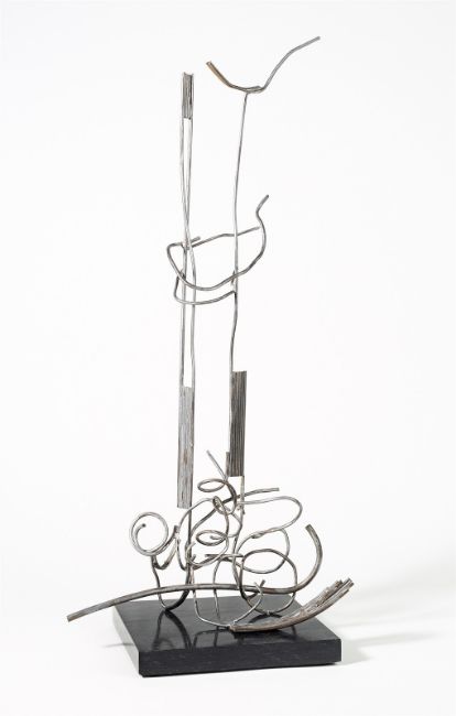 Messing und Zinn, auf schwarzen Granitsockel montiert. Maße (mit Sockel): 57,5 × 26,2 × 20 cm (22 ⅝ × 10 ⅜ × 7 ⅞ in.). Auf der Unterseite des Sockels monogrammiert und datiert (eingeritzt): M-D 95.