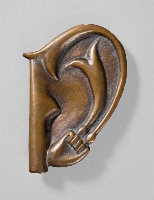 Original-Kartonschachtel mit Bronze mit brauner Patina. Schachtel: 8 × 11,9 × 3 cm bzw. Bronze: 11 × 7,4 × 1,6 cm (3 ⅛ × 4 ⅝ × 1 ⅛ in. bzw. Bronze: 4 ⅜ × 2 ⅞ × ⅝ in.). Auf der Unterseite der Bronze monogrammiert und datiert: M.O. 1933-1977.