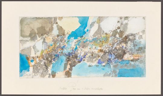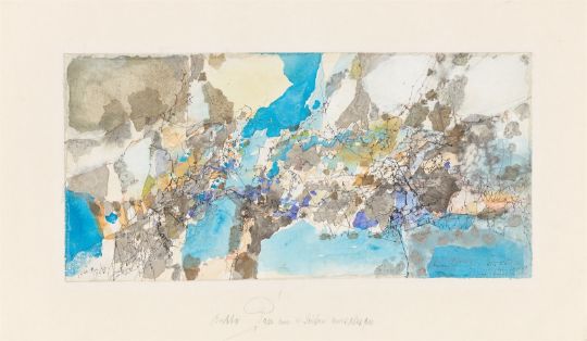 Tuschfeder, Aquarell, Bronzefarbe und Sand auf Bütten. 20,6 × 42,6 cm (8 ⅛ × 16 ¾ in.). Unten links signiert und datiert: Hubert Berke 1967. Unten rechts von Brunhilde Berke, der Frau des Künstlers, gewidmet, datiert und signiert: 13.11.69 Brunhilde Berke.