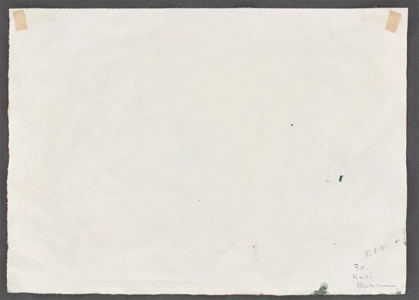 Zustandsbericht: In gutem Zustand. Die Blattkanten ohne Einrisse oder Fehlstellen. Das Papier technikbedingt leicht gewellt und minimal knittrig. Unter UV-Licht sind keine Retuschen oder Restaurierungen erkennbar. Rückseitig mit Atelierspuren. In den oberen Blattecken jeweils ein Papierklebestreifenreste und mit Papierklebestreifen auf den Unterkarton montiert.