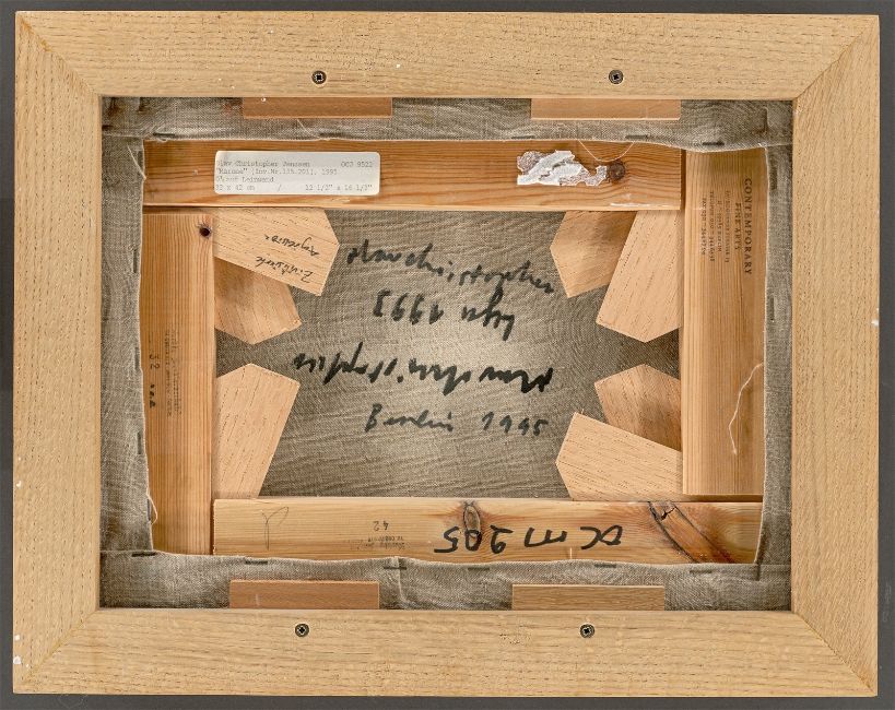 Öl auf Leinwand. 32,5 × 42,3 cm (12 ¾ × 16 ⅝ in.). Rückseitig mit Filzstift in Schwarz zweifach signiert, bezeichnet und datiert: Olav Christopher Lya 1993 bzw. Olav Christopher Berlin 1995. Auf dem Keilrahmen mit Filzstift in Schwarz bezeichnet: OC m 205.