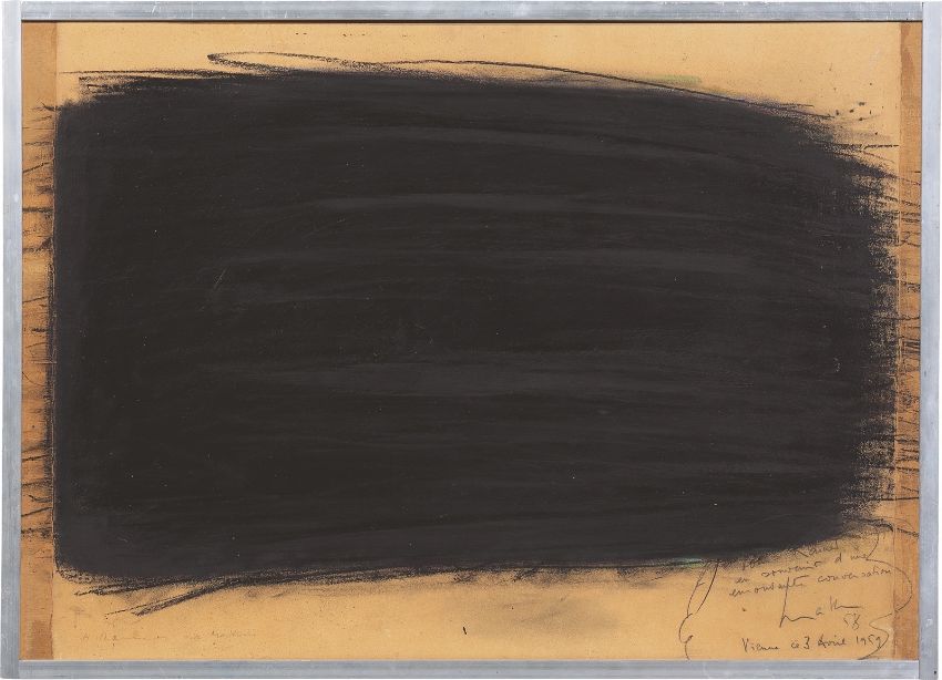 Öl- und Farbkreide über einer Farblithografie auf Papier, auf Holz aufgezogen. 52 × 72 cm (20 ½ × 28 ⅜ in.). Unten links mit Bleistift signiert und betitelt: A. Rainer sur Mathieu. Die übermalte Farblithografie von Georges Mathieu unten rechts mit Bleistift gewidmet, signiert, datiert und bezeichnet: pour Rainer en souvenir d´une emouvante conversation, Mathieu 58, Vienne le 3 Avril 1959. Rückseitig mit Kreide in Blau bezeichnet und datiert: 77, 59/60.