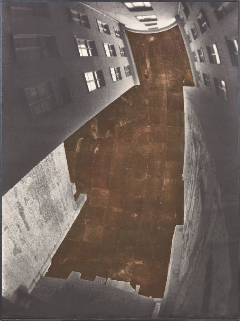 Blattsilber auf Fotoleinen. 160 × 120 cm (63 × 47 ¼ in.).