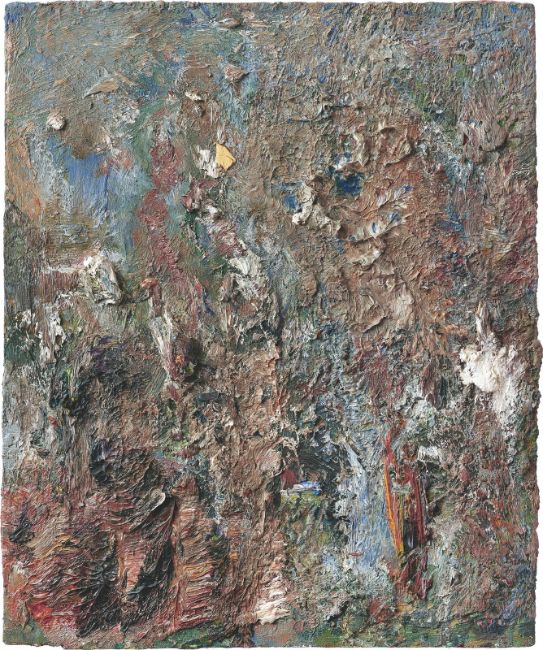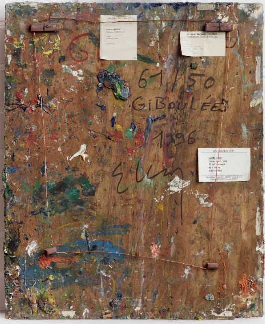 Öl auf Holz. 62 × 50,5 cm (24 ⅜ × 19 ⅞ in.). Rückseitig mit Filzstift in Schwarz mit der Maßangabe bezeichnet, betitelt, datiert und signiert: 61/50 GIBOULÉES 1996 E. Leroy. Hier mit Etiketten der Galerien Michael Werner, Köln; Galerie de France, Paris; Galerie Fred Jahn, München (hier jeweils mit der gedruckten Werknummer LER 357 bzw. LER 357/00 und mit der abweichenden Technikangabe: Öl auf Leinwand).