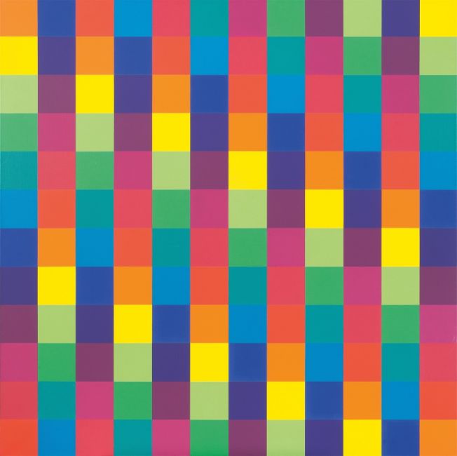 Öl auf Leinwand. 150 × 150 cm (59 × 59 in.). Auf dem Keilrahmen mit Filzstift in Schwarz bezeichnet, signiert, betitelt und datiert: 884 Richard Paul Lohse 12 systematische Farbreihen 1945/82 A oben.