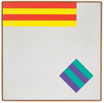Acryl auf Leinwand. 60 × 60 cm (23 ⅝ × 23 ⅝ in.). Rückseitig mit Filzstift in Grün signiert: graeser. Auf einem maschinengeschriebenen Etikett auf dem Keilrahmen beschriftet: komplementär disloziert, 1974 (60 × 60 cm). Ebendort ein Etikett der Camille Graeser Stiftung, Zürich, mit der gedruckten Werknummer 292 sowie der Gimpel-Hanover + André Emmerich Galerien, Zürich, und einem Stempel der Galerie Teufel, Köln.