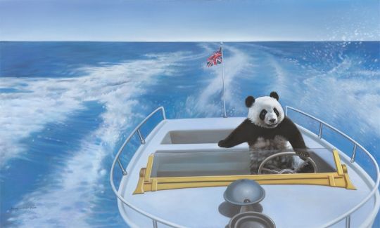 Öl auf Leinwand. 121,5 × 200 cm (47 ⅞ × 78 ¾ in.). Unten links signiert und datiert: Zhang Qikai 2007. Auf dem Mittelkreuz mit Filzstift in Schwarz betitelt, bezeichnet, signiert und datiert: Title: Crossing the Englich [sic] Channel in the same pose oil on canvas 120 × 200 cm 2007 Zhang Qikai. Ebendort ein Etikett der Marlborough Gallery, London.