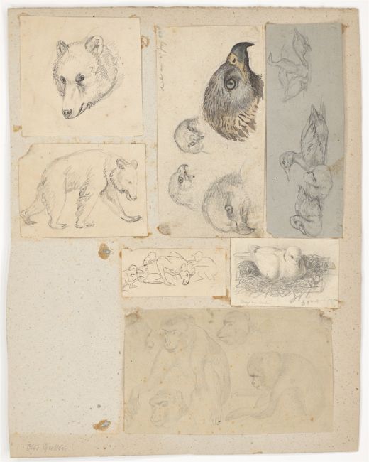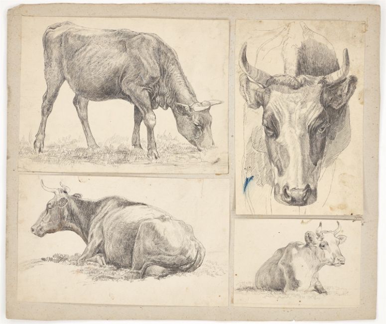 Ecke oben links ausgeschnitten. Zwei Beigaben: 1) Vier Kuhstudien. Jeweils Feder in Schwarz, teilweise mit Bleistift, auf Papier auf Karton. Zwischen 10 × 14,5 und 17,8 × 24 cm (36,3 × 42,5 cm) 2) Sieben Tierstudien. Um 1824/33. 7 Zeichnungen in Bleistift, Feder in Schwarz bzw. Aquarell auf unterschiedlichen Papieren, auf einen Bogen Papier fest montiert. Zwischen 3,9 × 8,5 cm und 10,1 × 17 cm (36,4 × 28, 4 cm). [3018]