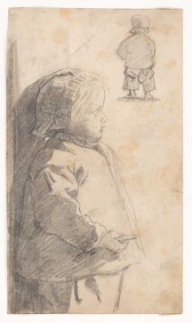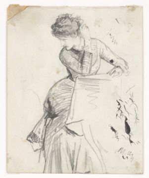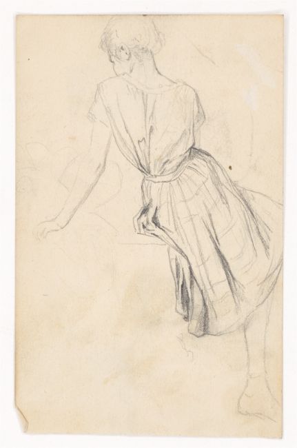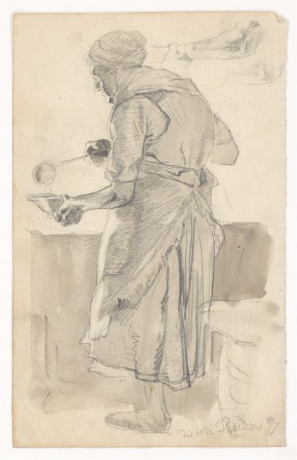 2) Hans Speckter: Rückenfigur einer Frau mit Suppenschüssel. Pinsel in Grau über Bleistift auf Papier, 23,3 × 14,6 cm.