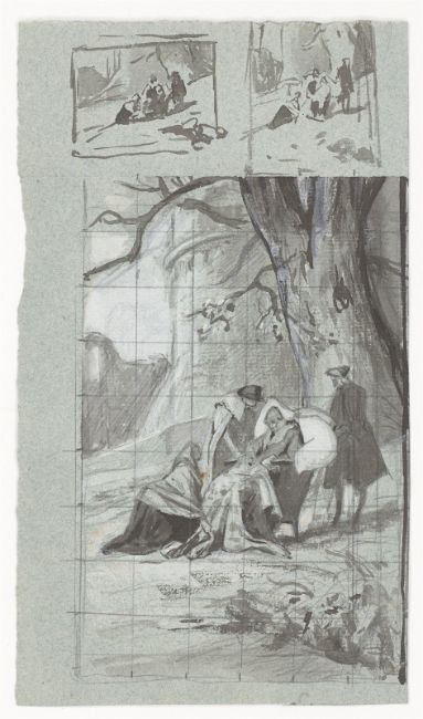 8) Hans (oder Otto) Speckter: Szene im Park (Studienblatt mit einer großen und zwei kleinen Darstellungen am oberen Rand). Pinsel in Schwarz über Bleistift, weiß gehöht und quadriert, auf graublauem Bütten, 12,7 × 22,2 cm.