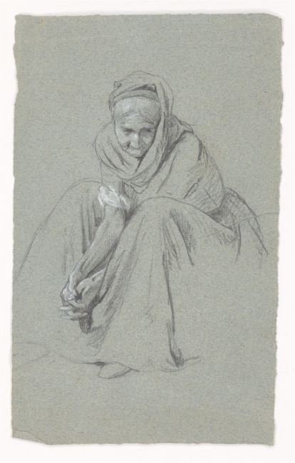 7) Hans (oder Otto) Speckter: Sitzende alte Frau mit gefalteten Händen. Bleistift, weiß gehöht, auf grau-blauem Bütten, 18,5 × 11,5 cm.