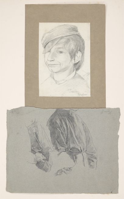 1) Hans Speckter: Zwei Zeichnungen, vertikal unter einem Passepartout angeordnet, 59,8 × 40 cm. a) Kopf eines grinsenden Jungen. Bleistift auf Papier, 20,2 × 14,1 cm. b) Gewandstudie. Bleistift auf grau- blauem Bütten, 23,4 × 31,2 cm. Rückseitig, um 90° gedreht: Sitzender Junge mit gefalteten Händen, der Kopf auf dem rechten Unterarm. Bleistift.