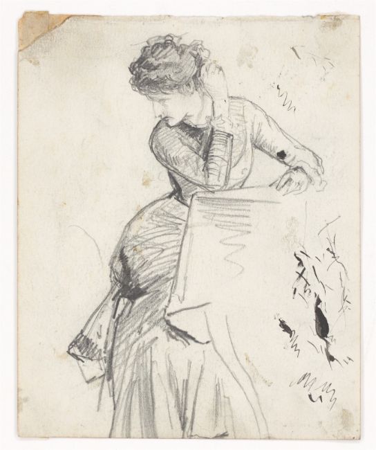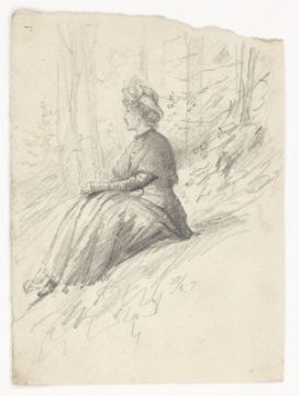 4) Hans Speckter: Im Wald sitzende Frau. Bleistift auf leichtem Karton, 16,2 × 11,7 cm.