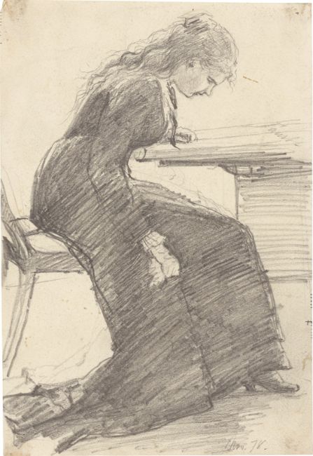 11) Hans Speckter: Frau, am Tisch sitzend. Tuschfeder und Bleistift auf Papier, 14 × 11,4 cm. [3018]