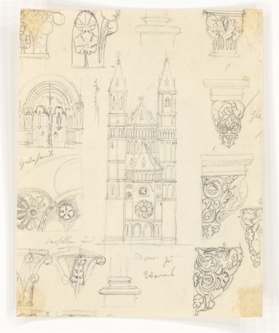 Rückseitig: Bleistiftskizzen des Wormser Doms (Ansicht von Osten und beschriftete Detailstudien). [3018]