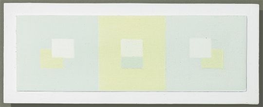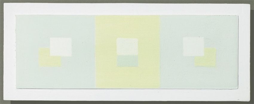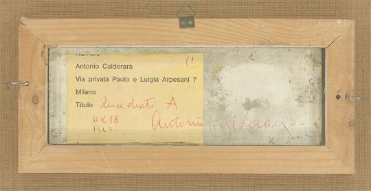 2-teilig: jeweils Öl auf Holz, im originalen Künstlerrahmen. Jeweils 6 × 18 cm (8 × 20,2 cm), gerahmt: 24,7 × 37 cm (2 ⅜ × 7 ⅛ in. (3 ⅛ × 8 in.), gerahmt: 9 ¾ × 14 ⅝ in.). Jeweils rückseitig auf einem mit der Adresse des Künstlers bedruckten Etikett mit Kugelschreiber in Rot und Schwarz betitelt, bezeichnet, datiert und signiert: Quadrati A bzw. B 6 × 18 1967 Antonio Calderara.