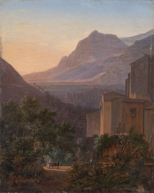Öl auf Holz. 26,4 × 21,3 cm (10 ⅜ × 8 ⅜ in.). Rückseitig mit Feder in Schwarz (nur unter UV-Licht lesbar) beschriftet: Le village de Papigno [...].