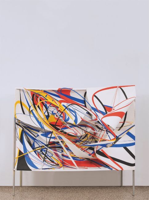 Stahlblech, Draht, geschweißt und verschraubt, bemalt, auf Stahlgestell montiert. Objekt: 148 × 210 × 119 cm / Gestell: 189 × 210 × 61 cm (58 ¼ × 82 ⅝ × 46 ⅞ in. / Gestell: 74 ⅜ × 82 ⅝ × 24 in.). Rückseitig mit Pinsel in Schwarz signiert und datiert: R. Heller 1966.