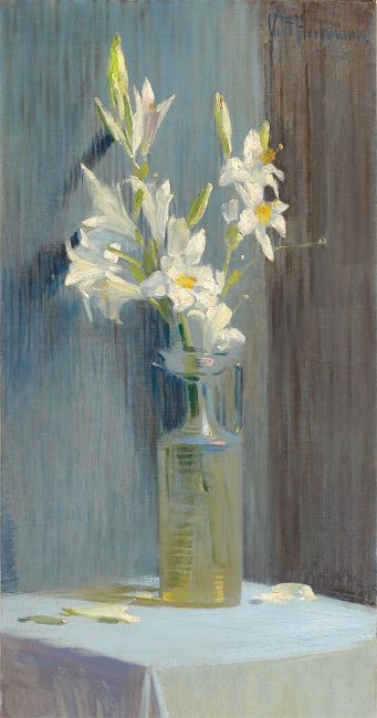 Curt Herrmann (Merseburg/Saale 1854 – 1929 Erlangen). Weiße Lilien in opalisierender Jugendstilglasvase. 1896
