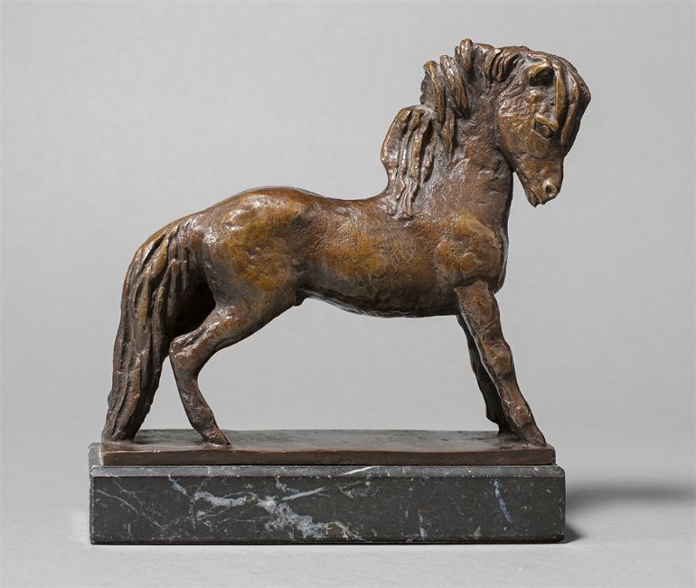 Bronze mit brauner Patina, auf Marmorsockel montiert. 11,1 × 12 × 3 cm (4 ⅜ × 4 ¾ × 1 ⅛ in.). Auf der Plinthe neben dem Schweif monogrammiert. RS. Auf der hinteren Schmalseite der Plinthe der Gießerstempel: NOACK BERLIN.