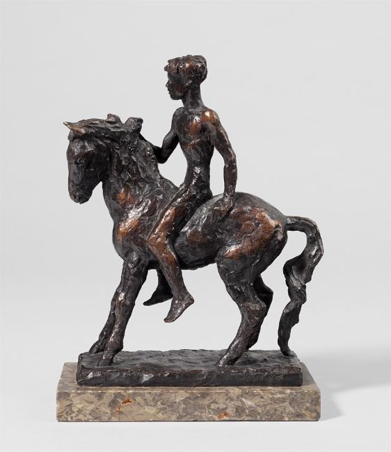 Bronze mit schwarzbrauner Patina, auf Marmorsockel montiert. 16,8 × 13,4 × 4,8 cm (6 ⅝ × 5 ¼ × 1 ⅞ in.). Auf der hinteren Schmalseite der Plinthe monogrammiert: RS. Dort auch der Gießerstempel: NOACK BERLIN.