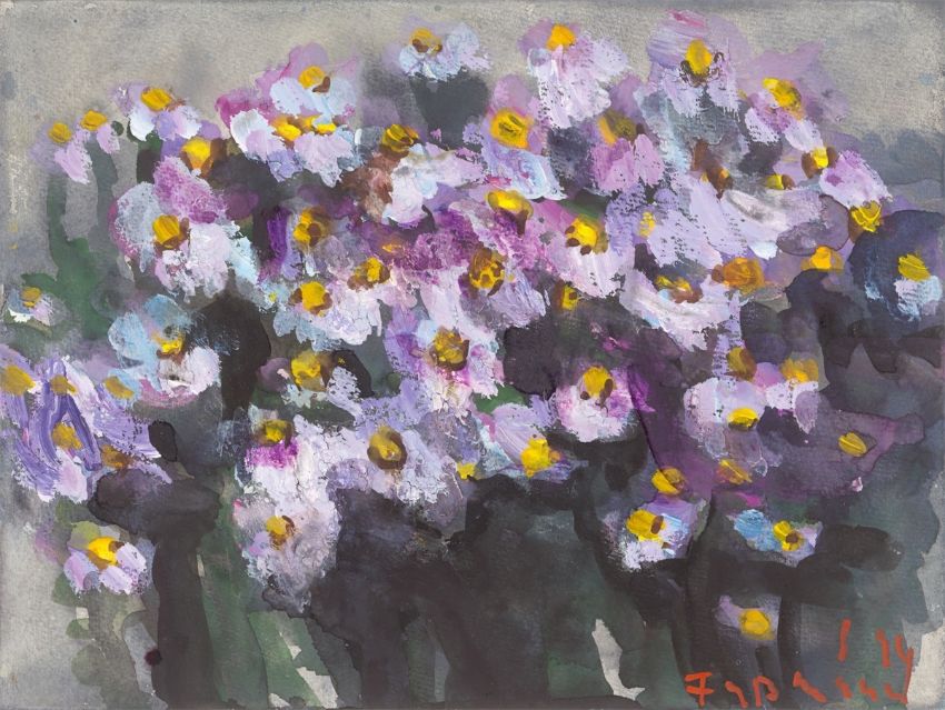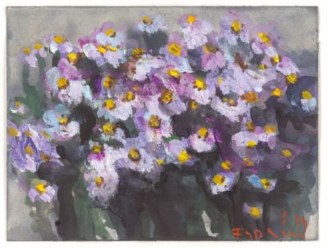 Zustandsbericht: Schöner harmonischer Gesamteindruck. Das Papier technikbedingt leicht gewellt. Die Blattkanten ohne Einrisse oder Fehlstellen. Unter UV-Licht sind keine Retuschen oder Restaurierungen erkennbar. Stellenweise leichtes Craquelé in den pastosen Farbflächen. Rückseitig mit Papierklebestreifen auf den Unterlagekarton montiert.