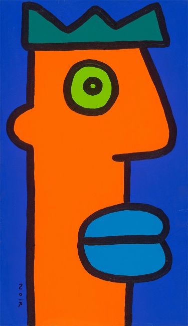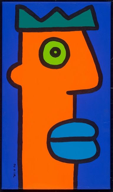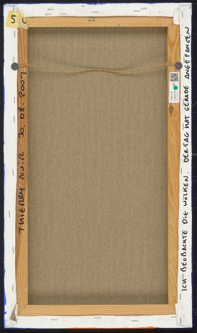 Acryl auf Leinwand. 60,2 × 35,1 cm (23 ¾ × 13 ⅞ in.). Unten links signiert: NOIR. Rückseitig mit Filzstift in Schwarz auf dem Überspann betitelt bzw. auf dem Keilrahmen signiert und datiert: ICH BEOBACHTE DIE WOLKEN. DER TAG HAT GERADE ANGEFANGEN THIERRY NOIR 30.08.2003.