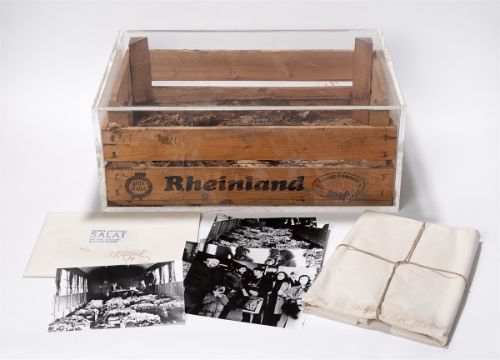 Holzkiste, typografisch bedruckt, mit getrockneten Salatblättern bzw. typografisch bedruckter Papierumschlag, gefalteter Stoff mit Bindfaden und Bronzeklumpen, jeweils in Plexiglasbox (eine typografisch bedruckt). 25 × 62,6 × 42,2 cm bzw. 42,4 × 62,7 × 5,8 cm (9 ⅞ × 24 ⅝ × 16 ⅝ in. bzw. 16 ¾ × 24 ⅝ × 2 ¼ in.). Die Holzkiste, der Papierumschlag und der Stoff jeweils signiert.