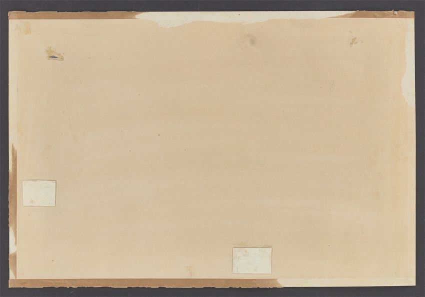 Zustandsbericht: Die Blattkanten ohne Einrisse oder Fehlstellen. Die Farben leicht geblichen. Das Papier ungleichmäßig gebräunt. Die Ecken schwach bestoßen. Punktuell kleine Oberflächenbeschädigungen. Links unten sowie an der linken Blattkante zwei restaurierte bzw. hinterlegte Stellen. Am rechten Rand mittig eine restaurierte und hinterlegte Stelle. Am oberen Rand links eine diagonal verlaufende Knickspur. Rückseitig umlaufend entlang der Kanten Papierklebebandreste einer ehemaligen Montierung sowie stellenweise oberflächliche Papierausdünnungen.