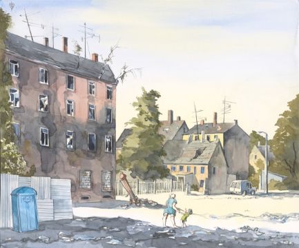 Aquarell und Tuschfeder auf Velin. 49,6 × 59,7 cm (19 ½ × 23 ½ in.). Oben rechts monogrammiert, datiert und mit dem Künstlersignet versehen: K H R 94. Rückseitig signiert, datiert und betitelt: K.H.Roehricht / Juli 1994 Leipzig-Stünz "Trümmer schaffen ohne Waffen".