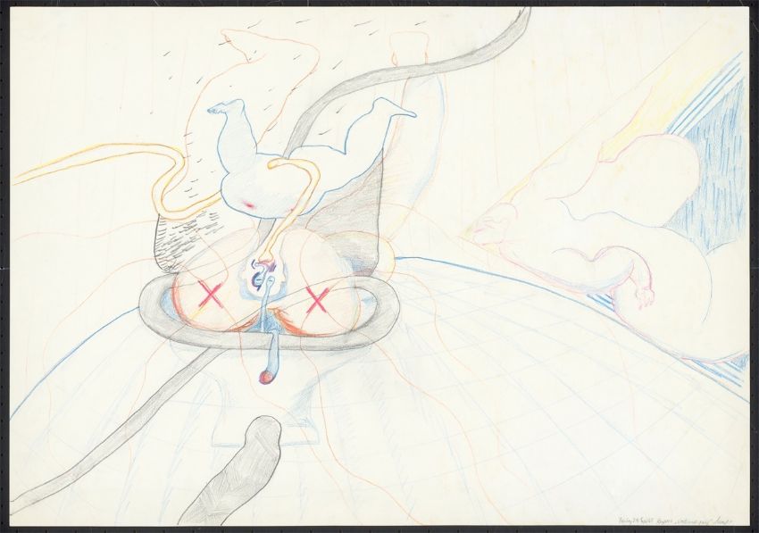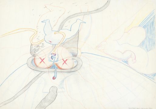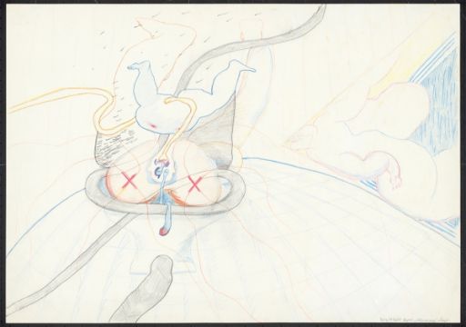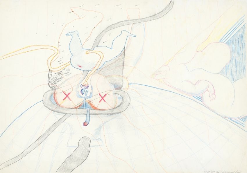 Blei- und Buntstift auf Papier. 42,7 × 60,2 cm (16 ¾ × 23 ¾ in.). Unten rechts datiert, betitelt und signiert: Freitag 24. Sept 65 Rupert „Verkündigung" Lausen.
