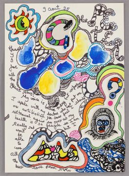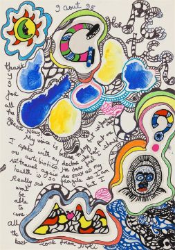 Filz- und Buntstift, Gouache und Collage auf Papier. 29,5 × 20,9 cm (11 ⅝ × 8 ¼ in.). Oben mittig datiert, unten mittig signiert: 9 aout 95 Niki.
